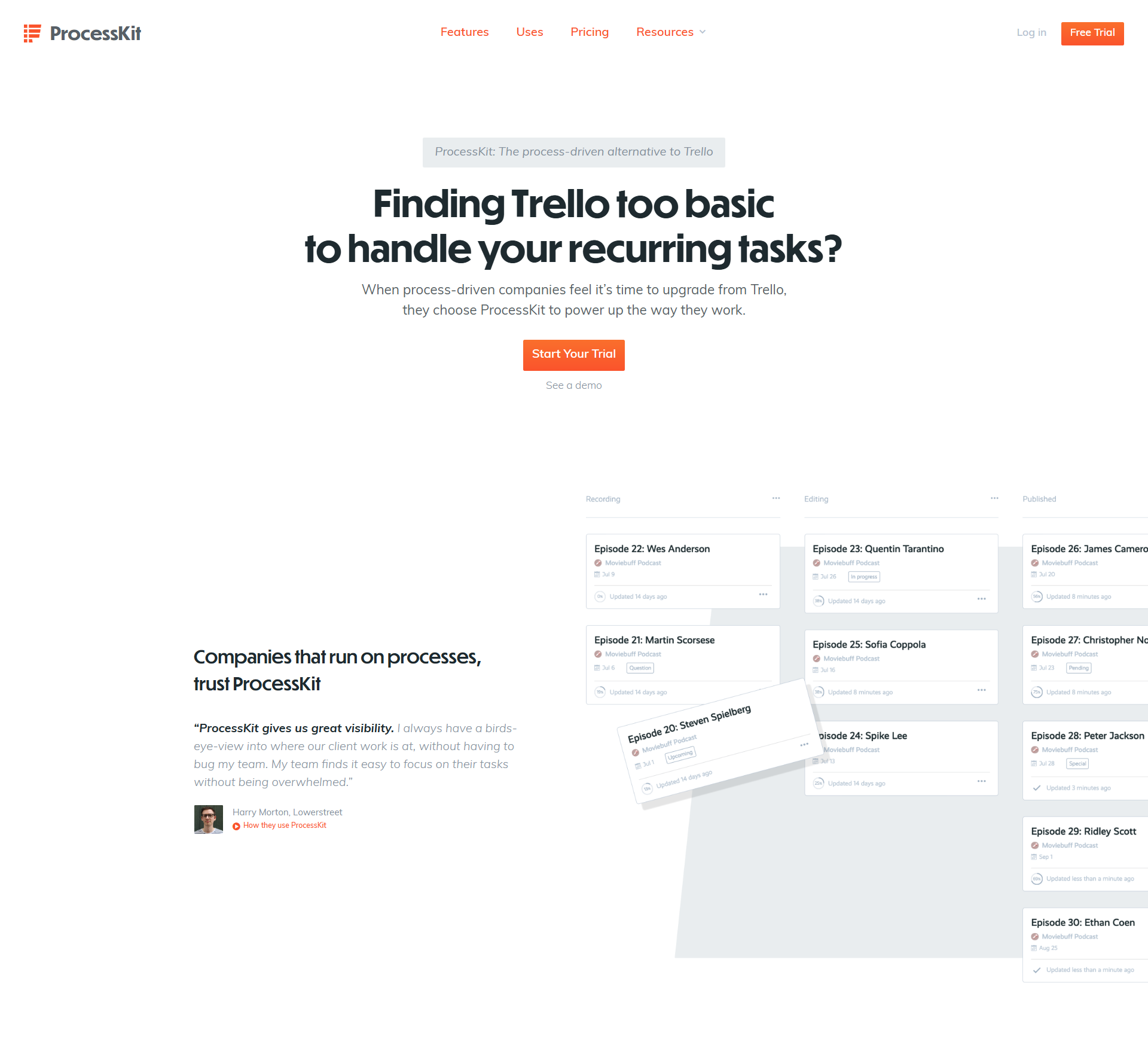 This is one comparison page that we wrote for a client, which is ProcessKit. And in this case, ProcessKit is a project management tool. But at the same time, it's not really as broad as Asana or Trello or ClickUp. They've built ProcessKit for companies that are productized in a way, and what that means is that for every single project, their process looks the same every single time. That's why it's called ProcessKit, and we identified that a lot of people were searching for keywords like "Asana recurring tasks" or "Trello recurring tasks," and that kind of gave us the signal that these are people or customers that are struggling to do this in Trello, and this is exactly what we do: help you manage these recurring tasks, and we build a whole narrative for this comparison page based on that single idea. And when Trello feels like not the right tool to do that, then you should come or you should choose ProcessKit instead.